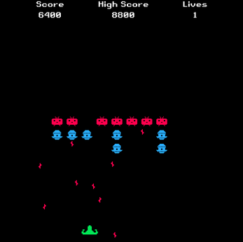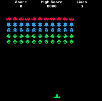 - Each alien shoots at a different speed: greens slow, blue medium and red faster.